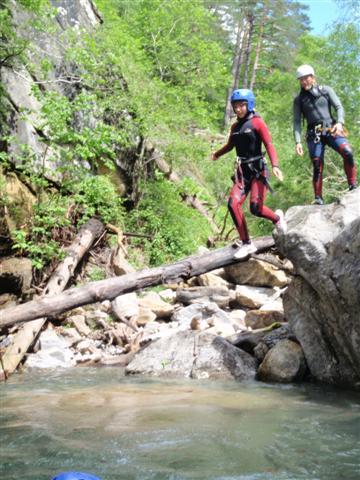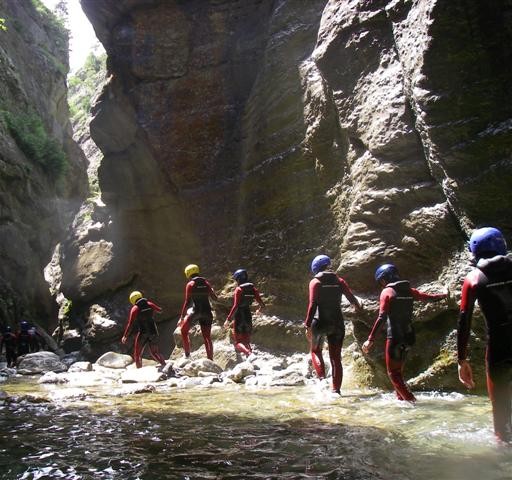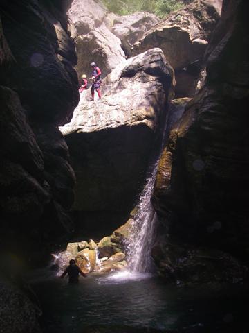 También lo podemos realizar con dos coches y con el segundo pasaremos los túneles. Después de ellos sale una pista a la derecha que baja al cauce por debajo de la presa. Normalmente la primera parte está algo sucia debido a un antiguo vertedero. Ya dentro de la garganta disfrutaremos de sus paredes alas y erosionadas por el río. Desfiladero sombrío y en ocasiones con claroscuros. Al llegar al caos de bloques, pasaremos por debajo de unas piedras empotradas, llamado el puente del diablo. Sortearemos varios resaltes y llegaremos al único rápel de esta garganta. En este mismo lugar cae el afluente a la izquierda. Super bien equipada, hay instalaciones por todas parte. Después de este obstáculo, pasaremos por debajo de unos bloques empotrados. A continuación el desfiladero nos obliga a sortear varios resaltes y a nadar en alguna ocasión. Después de la última badina saldremos por la derecha donde encontraremos el camino de retorno, que asciende hasta la pista y descenderemos a la fuente y al aparcamiento.