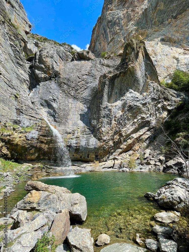 Salimos de Escarrilla en dirección al Portalet y justo antes de cruzar el puente sobre el Río Escarra nos metemos a la izquierda por el trazado de la antigua carretera. Sin llegar a cruzar el río seguiremos unos metros por la pista que remonta el cauce para entrar a la izquierda en un sendero que cruza dos barrancos en una zona bastante vestida por la vegetación, donde sobresale en temporada el fuerte olor de la menta de burro (Mentha longifolia). Llegamos a otra pista que remontaremos a nuestra derecha escasos metros para continuar por el sendero ascendente que discurre por la umbría de una roca y salimos a otra pista.